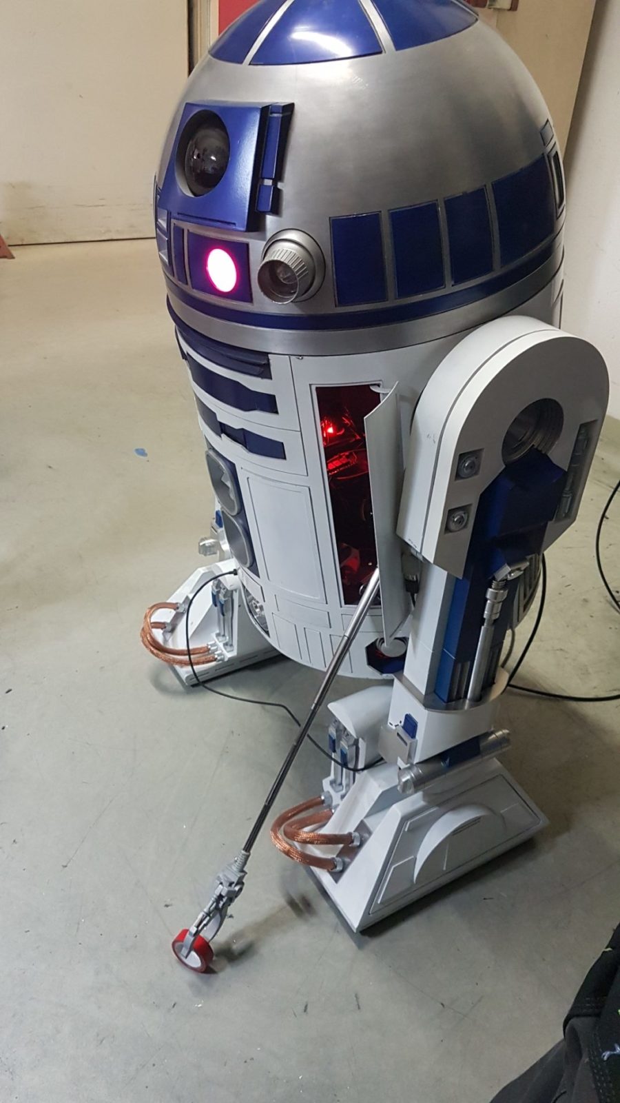 Einen Arm der die berechnete Distanz vom Droiden zum Boden überwinden kann war die erste Herausforderung. Das größere Problem war aber die komplette Technik in den Body des R2 zu bekommen.
