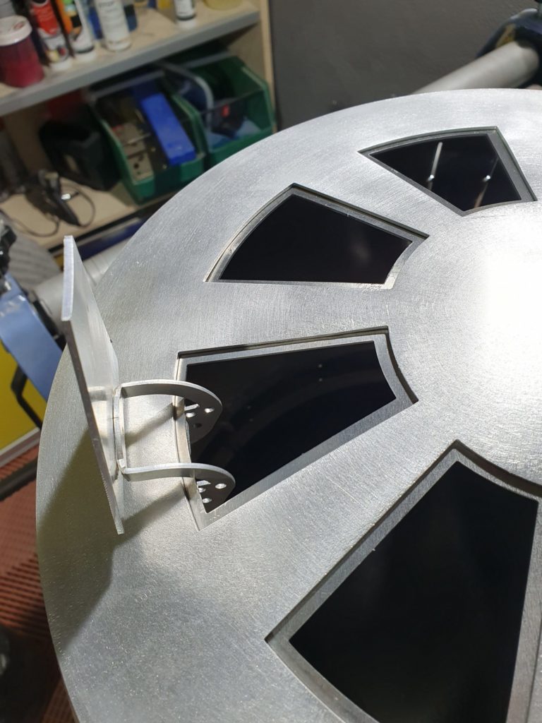 Die Streben vom Nacken sind aus CNC gefrästen Stäben, die von innen verschraubt werden. Insgesamt ist dieser Dome sehr leicht konstruiert und durch die Blechverarbeitung kann der Außenradius an einigen Stellen leicht abweichen.
