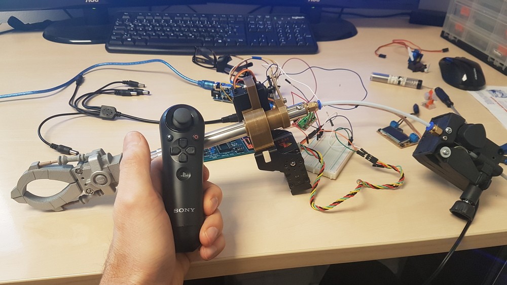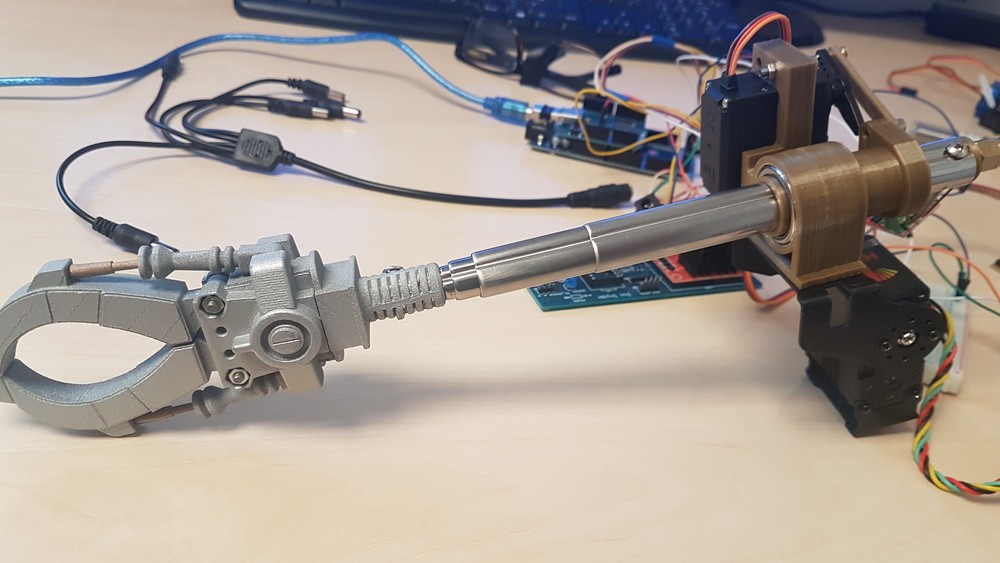 My first Controler test for the Extreme extendble Gipper Arm. the Claw is 3D Printed Design by TEXMEX . Rest is a old Selfi Stick and a Motor from a Mig Welder. MG996 Servo for rotate the Arm and for the Main Up and Down the lynx Motion HD-Servo who can handle a Lot of